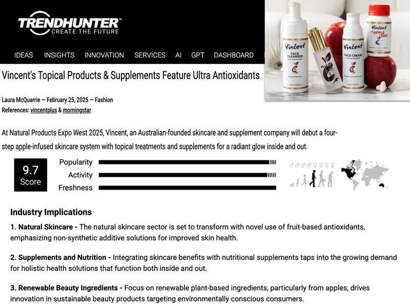 At Natural Products Expo West 2025, Vincent, an Australian-founded skincare and supplement company will debut a four-step apple-infused skincare system with topical treatments and supplements for a radiant glow inside and out.