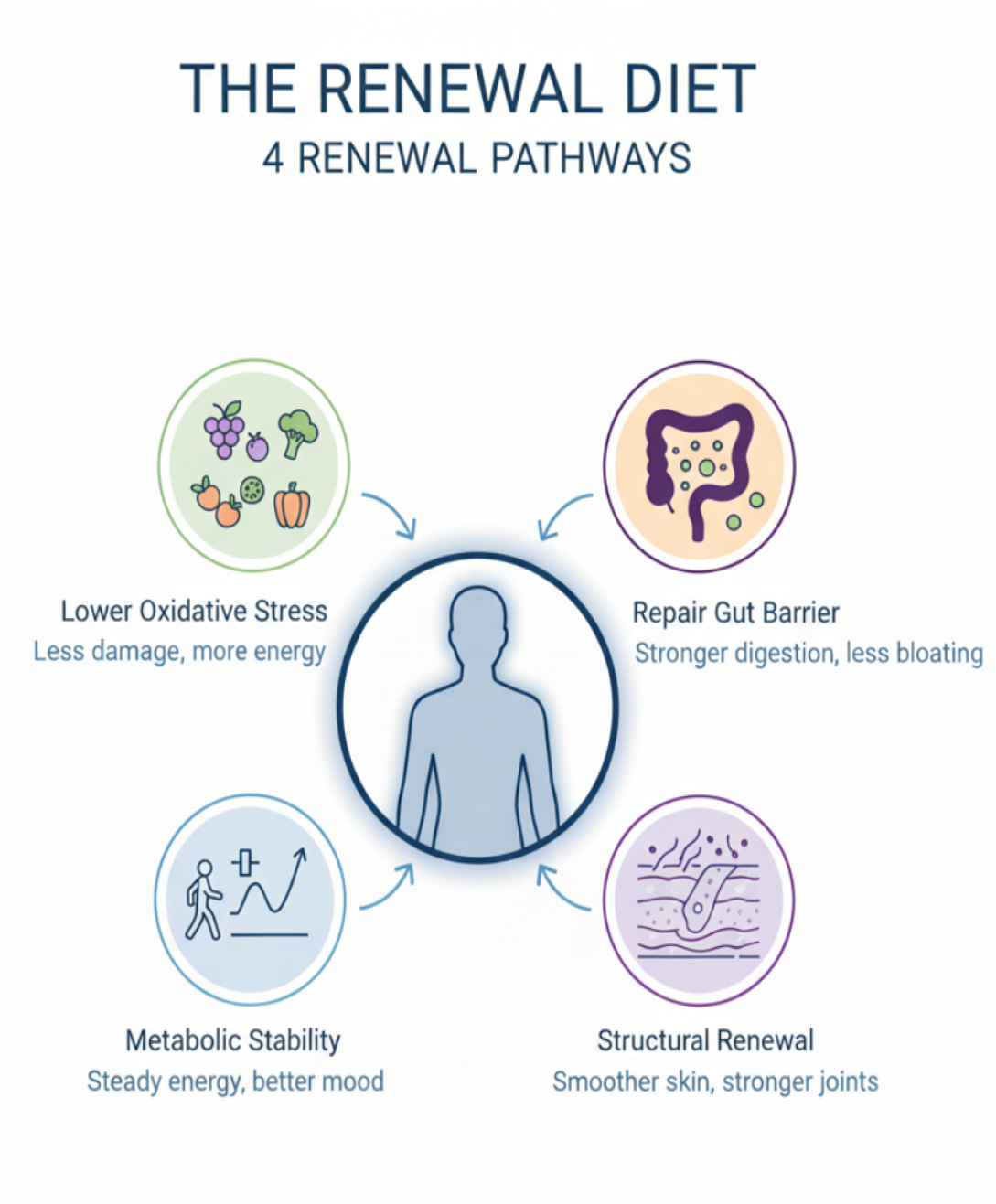 The Renewal Diet is a simple way of eating that focuses on whole foods, colourful plants and targeted supplements to reduce oxidative stress, support your gut, stabilise blood sugar and protect your skin and connective tissue.