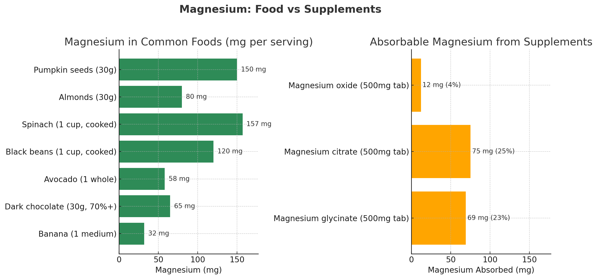 Absorption: Magnesium from food is naturally bound to compounds your body recognises and uses more effectively. Supplements often rely on chemical forms with variable absorption rates.